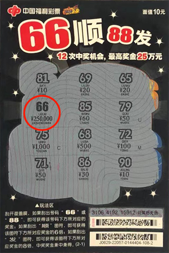 近日,我市福彩各票種喜訊頻傳,又有一位幸運市民在刮刮樂彩票“66順88發(fā)”中刮出最高獎25萬元。