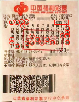 6月12日晚,快樂8游戲第2023153期開獎。當期出自新北區(qū)春江鎮(zhèn)32040872福彩投注站的一張選五4膽全拖票,以“37、45、55、56”4個號碼為膽碼、其余76個號碼為拖碼“組隊迎戰(zhàn)”,并進行了10倍投注。開獎后經核對,該張彩票共計中得160注“選五中五”和600注“選五中四”。根據快樂8“特定玩法獎上獎”的派獎規(guī)則,“選五中五”單注獎金從1000元提高至1400元,因此該張彩票共計中得獎金23.66萬元,其中包括派獎獎金6.4萬元。