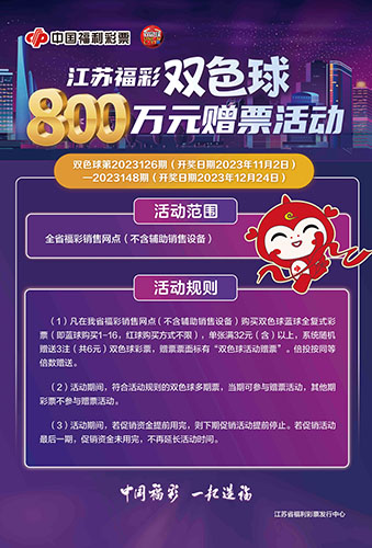 為回饋廣大購彩者對雙色球游戲的喜愛和支持,江蘇福彩將于雙色球第2023126期開始,開展雙色球800萬元贈票活動。