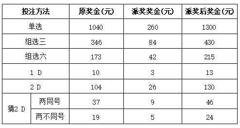 活動(dòng)期間,凡在我省福彩銷售網(wǎng)點(diǎn)購(gòu)買3D游戲彩票,單票金額超過(guò)20元(含)的中獎(jiǎng)彩票均可參與派獎(jiǎng)活動(dòng),具體派獎(jiǎng)規(guī)則如下: