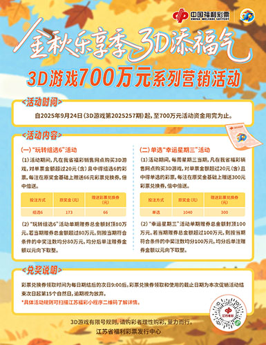 金秋樂(lè)享季,3D添福氣。江蘇福彩攜3D游戲700萬(wàn)元系列營(yíng)銷活動(dòng)為廣大購(gòu)彩者送上一份清新的秋日好禮。