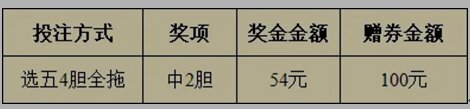 1.活動期間,凡在我省福彩銷售網(wǎng)點購買快樂8游戲“選五4膽全拖”(投注金額152元),且僅中得2膽的,單倍彩票在原中獎獎金54元基礎(chǔ)上贈送100元彩票兌換券,倍中倍送。