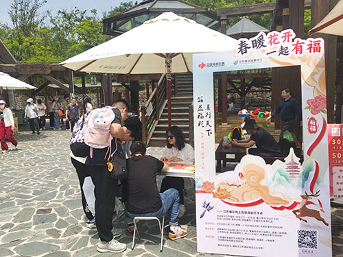 現(xiàn)場,江蘇福彩“春暖花開 一起有福”打卡活動吸引了不少市民和游客朋友們的目光。拍攝照片或視頻,并與江蘇福彩官方賬號互動,即有機會抽獎贏取玻璃杯、保溫杯、小電扇等小禮品。