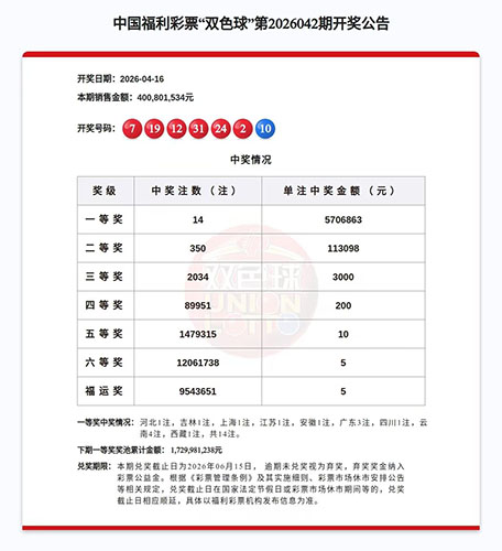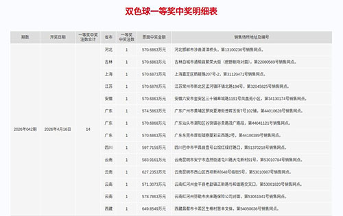4月16日晚,雙色球第2026042期開獎,開出紅球號碼2、7、12、19、24、31,藍球號碼10。當期全國一等獎中出14注,單注獎金570余萬元。出自新北區孟河鎮環鎮北路第32045825號福彩銷售網點的一張雙色球彩票中得1注一等獎、2注六等獎和1注福運獎,票面合計獎金為570.6878萬元。