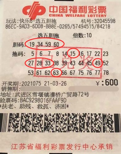 據(jù)了解,中獎者顧先生是福彩的鐵桿粉絲,近期對新游戲快樂8十分感興趣。326是快樂82021075期的開獎日。當期顧先生在武進區(qū)雪堰鎮(zhèn)32045598福彩銷售點,自選了1組選五膽拖號碼進行10倍投注,幸運中得60選五中五240選五中四
