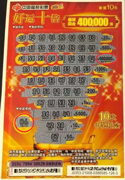 據(jù)了解,該中獎(jiǎng)?wù)唏R先生(化名)是一位彩票發(fā)燒友,縱橫彩場十余年,涉獵票種廣泛。近日,他到銷售點(diǎn)購買刮刮樂休閑,在一張“好運(yùn)十倍”彩票中刮出“我的號(hào)碼06”與“中獎(jiǎng)號(hào)碼06”相同,喜中對(duì)應(yīng)獎(jiǎng)金40萬元。