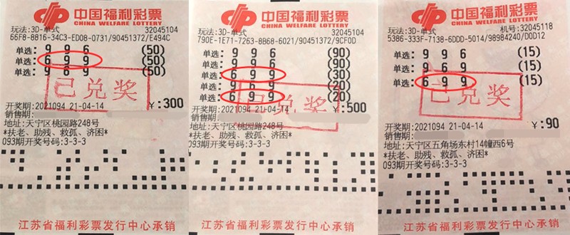 還有一位中獎?wù)邊窍壬ɑ┮淮涡詢度×?/span>3張中獎彩票。據(jù)了解,這3張彩票開獎期均為第2021094期,分別出自天寧區(qū)桃園路32045104福彩投注站和五角場32045118福彩投注站,合計(jì)對當(dāng)期開獎號碼“699”進(jìn)行了115倍單選投注,攬獲獎金13.8萬元。