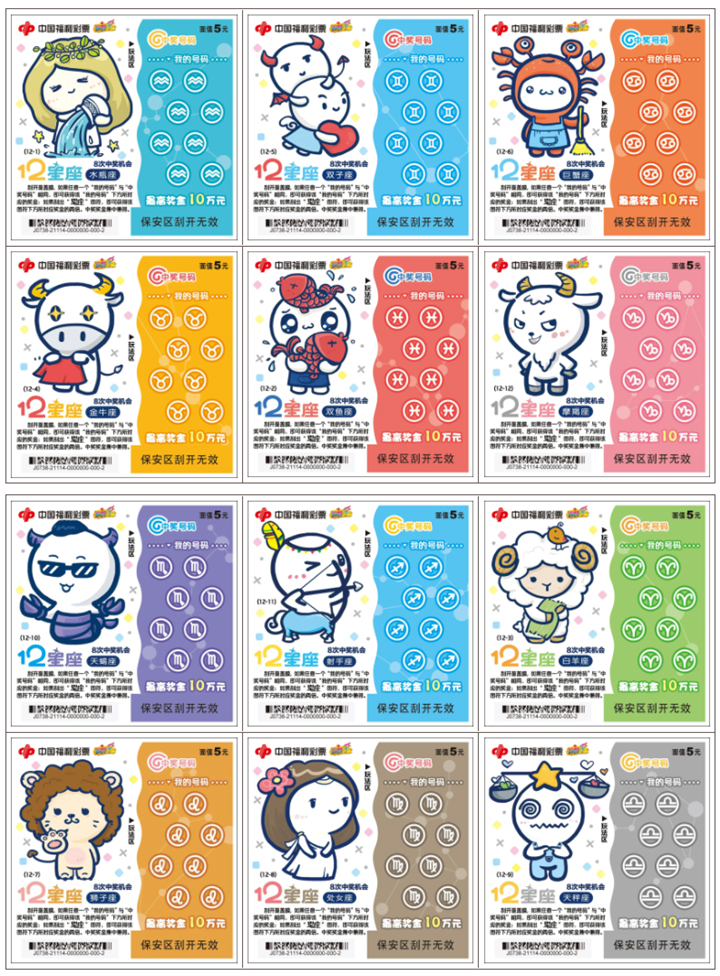 “12星座”是以“星座”為主題而設(shè)計(jì)的一款12聯(lián)票,畫面上12星座的卡通形象清新靚麗、萌意十足,玩法區(qū)圖案采用相應(yīng)星座代表符號(hào),與畫面風(fēng)格相呼應(yīng)。在玩法上,刮開覆蓋膜,如果任意一個(gè)“我的號(hào)碼”與“中獎(jiǎng)號(hào)碼”相同,即可獲得該“我的號(hào)碼”下方所對(duì)應(yīng)的獎(jiǎng)金;如果刮出“星座”圖符,即可獲得該圖符下方所對(duì)應(yīng)獎(jiǎng)金的兩倍。中獎(jiǎng)獎(jiǎng)金兼中兼得。