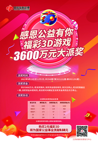 目前,3D游戲3600萬(wàn)元派獎(jiǎng)活動(dòng)正在火熱進(jìn)行中,返獎(jiǎng)率高達(dá)70%。3D驚喜派送,感恩公益有你,一起走進(jìn)身邊的福彩投注站,領(lǐng)取屬于你的那份好運(yùn)吧!
