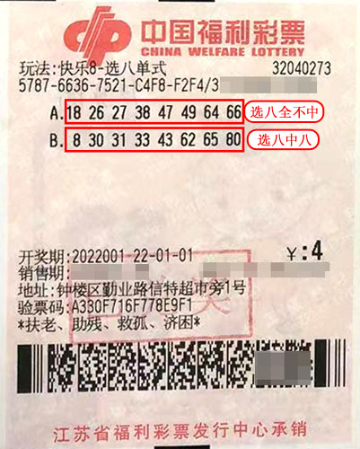 新晉彩友吳先生平日里偶爾購彩。近日,他在鐘樓區(qū)勤業(yè)路32040273福彩投注站投注時,在快樂8第2022001期花4元隨機投注了2組選八單式號碼,結(jié)果喜中1注“選八中八”和1注“選八全不中”,共計中得獎金5萬余元。