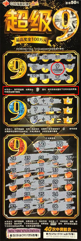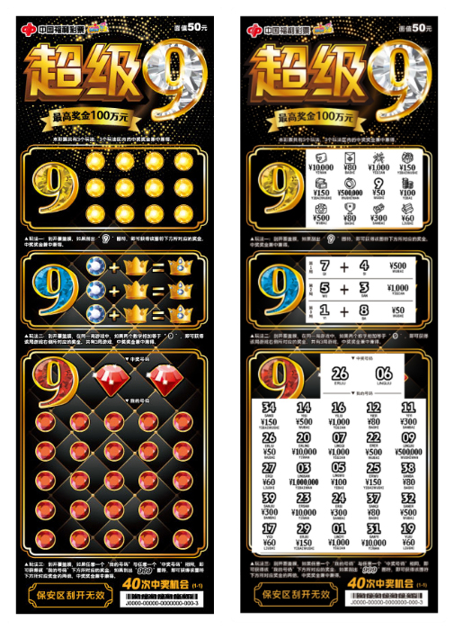 超級(jí)9”刮刮樂票面設(shè)計(jì)炫酷神秘、富有質(zhì)感。該票面值50元,獎(jiǎng)等共設(shè)置11級(jí),有40次中獎(jiǎng)機(jī)會(huì),最高可中100萬元。共有3個(gè)玩法,3個(gè)玩法區(qū)內(nèi)的中獎(jiǎng)獎(jiǎng)金兼中兼得。玩法一:刮開覆蓋膜,如果刮出“9”圖符,即可獲得該圖符下方所對(duì)應(yīng)的獎(jiǎng)金;玩法二:刮開覆蓋膜,在同一局游戲中,如果兩個(gè)數(shù)字相加等于“9”,即可獲得該局游戲右側(cè)所對(duì)應(yīng)的獎(jiǎng)金;玩法三:刮開覆蓋膜,如果任意一個(gè)我的號(hào)碼與任意一個(gè)中獎(jiǎng)號(hào)碼相同,即可獲得該我的號(hào)碼下方所對(duì)應(yīng)的獎(jiǎng)金;如果刮出“999”圖符,即可獲得該圖符下方所對(duì)應(yīng)獎(jiǎng)金的兩倍。