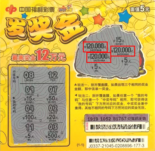 據了解,該中獎者劉先生(化名)是一位刮刮樂老粉。近日,他在店里隨機選購了幾張刮刮樂彩票,在其中一張“發(fā)獎金”彩票中,刮出3個相同的獎金金額,按照游戲規(guī)則中得對應獎金12萬元。