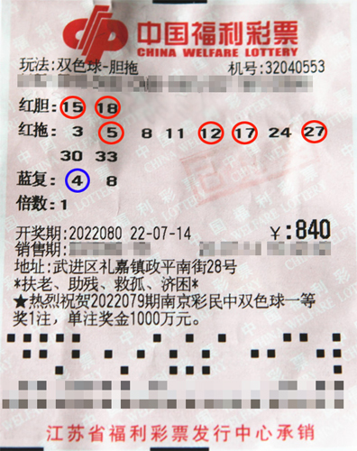 7月14日晚,中國(guó)福利彩票雙色球游戲進(jìn)行第2022080期開獎(jiǎng)。當(dāng)期雙色球紅球號(hào)碼為05、12、15、17、18、27,藍(lán)球號(hào)碼為04。當(dāng)期我省的1注一等獎(jiǎng)出自常州,這位幸運(yùn)彩民在常州市武進(jìn)區(qū)禮嘉鎮(zhèn)政平南街28號(hào),編號(hào)為32040553的投注站,采用自選膽拖復(fù)式投注的方式,共選定了420注號(hào)碼,花費(fèi)840元,幸運(yùn)中得一等獎(jiǎng)1注,二等獎(jiǎng)1注,三等獎(jiǎng)24注,四等獎(jiǎng)114注,五等獎(jiǎng)170注和六等獎(jiǎng)15注,共獲獎(jiǎng)金723萬(wàn)多元。