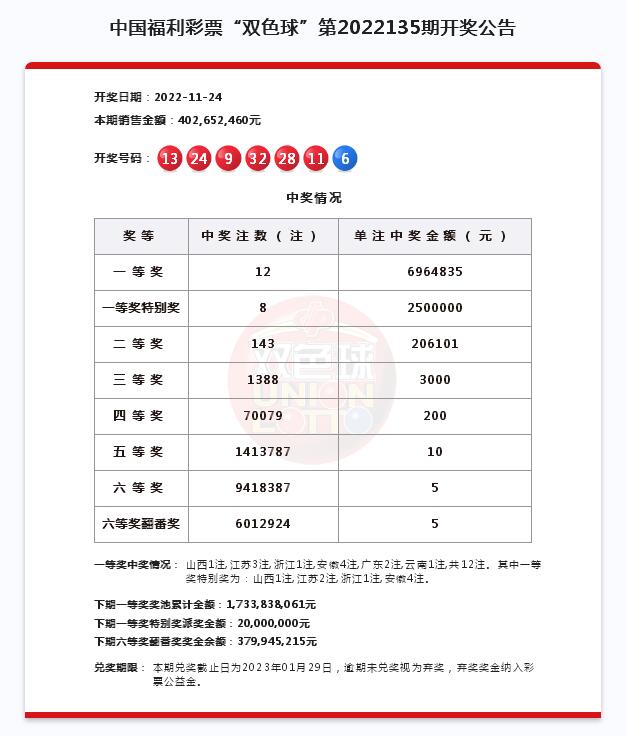 1124日晚,雙色球進行第2022135期開獎,開出紅球號碼91113242832,藍球號碼6。當期是雙色球12億元大派獎活動的第11期派獎,全國中出一等獎12注,單注獎金為696萬余元;其中一等獎特別獎中出8注,單注獎金為250萬元。