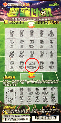 據(jù)了解,該中獎?wù)咧芟壬ɑ┦且晃挥惺嗄瓴数g的“老行家”,平時各票種均有涉獵,其中最喜刮刮樂。想到目前世界杯正在熱火朝天地進行著,他也湊熱鬧買了一本足球主題的“夢寐以求”,沒想到在其中一張彩票的“玩法一”中刮出了“球鞋”圖符,根據(jù)游戲規(guī)則中得下方對應最高獎金100萬元。