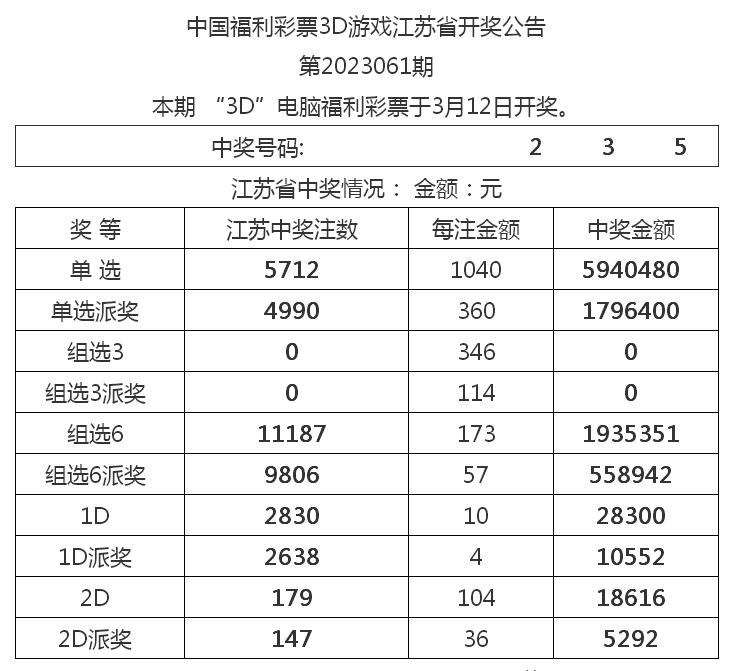 3月12日,3D游戲第2023061期開出號碼“2、3、5”。當期我市一位幸運市民通過倍投單選順利拿下獎金12.3萬余元。