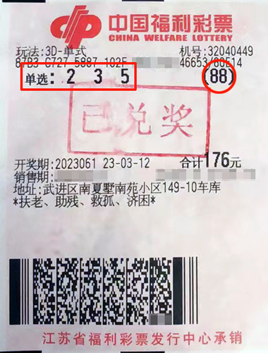 據(jù)了解,該中獎者是一位青年彩友,當期他在武進區(qū)南夏墅32040449福彩投注站購彩休閑,在高手朋友的指導下,對3D號碼“2、3、5”進行了88倍單選投注,并驚喜擊中開獎號碼。由于3D游戲正開展6000萬元派獎活動,每注單選獎金增加360元,因此,該幸運市民本次共計攬獲獎金12.3萬余元。