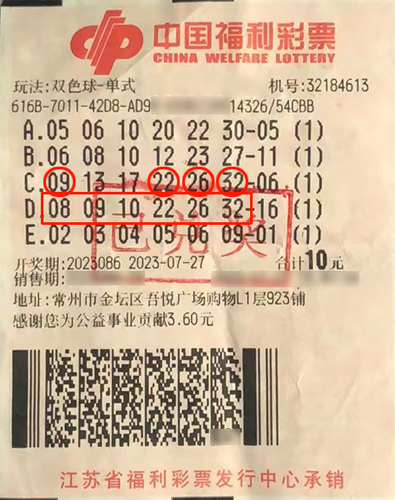 據(jù)了解,該獎出自金壇區(qū)吾悅廣場32184613福彩銷售點。中獎市民小張(化名)是一位90后,接觸彩票不久,偶爾購彩休閑。當期她在銷售點花10元錢自選投注了五組單式號碼,開獎后與開獎號碼紅球8910222632,藍球12”核對,發(fā)現(xiàn)其中一組號碼紅球全中,中得二等獎獎金12.5萬余元,另一組號碼擊中4個紅球,中得五等獎獎金10元。