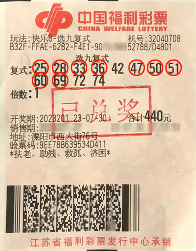 據(jù)了解,該獎出自溧陽市西大街32040708福彩銷售點。中獎者周女士(化名)是福彩的老朋友,偏愛投注電腦票。當期她在店里自選了一組選九復式號碼,開獎后經(jīng)核對,除了擊中1注“選九中九”,中得獎金30萬元外,還中得27注“選九中八”、108注“選九中七”、84注“選九中六”,共計攬獲獎金37.7萬余元。