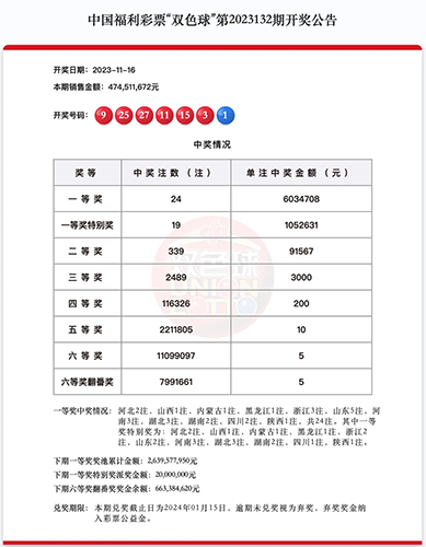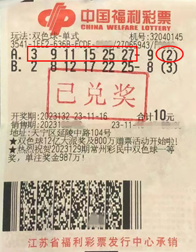 1116日,雙色球第2023132期開出紅球3911152527,藍(lán)球1。其中,二等獎中出339注,單注獎金9.15萬余元。當(dāng)期一位購彩者在天寧區(qū)延陵中路32040145福彩投注站,對自選的兩組單式號碼進(jìn)行多倍投注。開獎后經(jīng)核對,其中一組雙倍投注的號碼紅球全中,中得2注二等獎,共計(jì)攬獲獎金18.3萬余元。