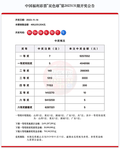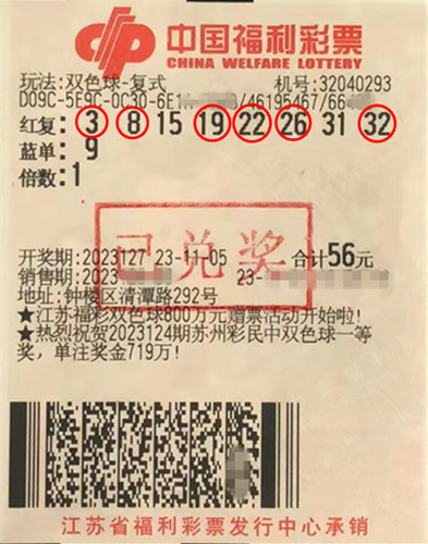 115日,雙色球第2023127期開出紅球3819222632,藍(lán)球14。其中,二等獎中出253注,單注獎金12.1萬余元。當(dāng)期一位購彩者在鐘樓區(qū)清潭路32040293福彩投注站,機(jī)選投注了一組復(fù)式號碼,幸運(yùn)中得1注二等獎、12注四等獎、15注五等獎,共計(jì)中得獎金12.4萬余元。