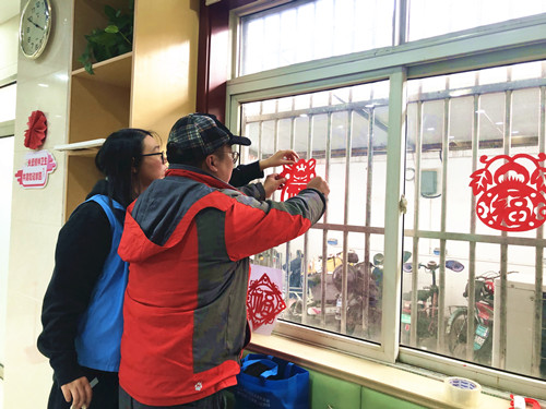 在初步了解中國(guó)剪紙文化的基礎(chǔ)上,社工向康復(fù)員示范剪紙技法,詳細(xì)講解剪紙的基本步驟和注意事項(xiàng)。大家認(rèn)真聆聽(tīng),用心感悟,起初手法略顯生疏,但隨著不斷地摸索與實(shí)踐,逐漸熟悉了基本手法,一張張紅紙?jiān)谒麄兪种凶兂梢粋€(gè)個(gè)花式字。大家?guī)е腋5男θ莅堰@些精心裁剪出來(lái)的字作品貼在驛站的門(mén)窗上,為驛站增添了濃濃喜氣。