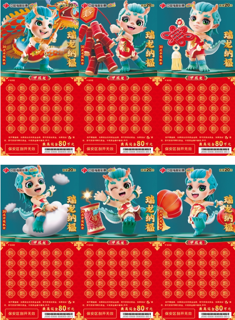 “瑞龍納福”游戲面值20元,全套為6張。該款游戲使用3D技術(shù)設(shè)計(jì)出“小瑞龍”形象。6張票呈現(xiàn)了舞龍、放鞭炮、掛燈籠等活潑歡快的動態(tài),活力滿滿迎新春。下方刮開區(qū)的福字,傳遞出“福到、運(yùn)到、財(cái)?shù)健⑾驳?/span>”的新春祝福。