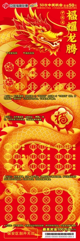 “福耀龍騰”游戲面值50元,以金龍扶搖直上作為主畫面,栩栩如生的龍高大威猛,閃爍著金色的光芒,頗有視覺沖擊力。全票四個玩法區(qū)如同祥云圍繞在金龍四周,以中國結(jié)、福字、燈籠、錢幣作為玩法區(qū)刮開圖符,畫面整潔、紅黃配色相得益彰,傳遞幸福繁榮之意。