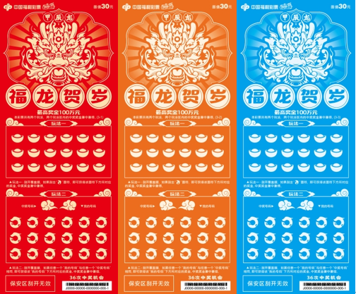 今年福彩刮刮樂生肖系列游戲共包含“祥龍報(bào)喜”“瑞龍納福”“福龍賀歲”“福耀龍騰”四款游戲,分10元、20元、30元、50元四個面值,票面精美、面值多樣、年味十足。