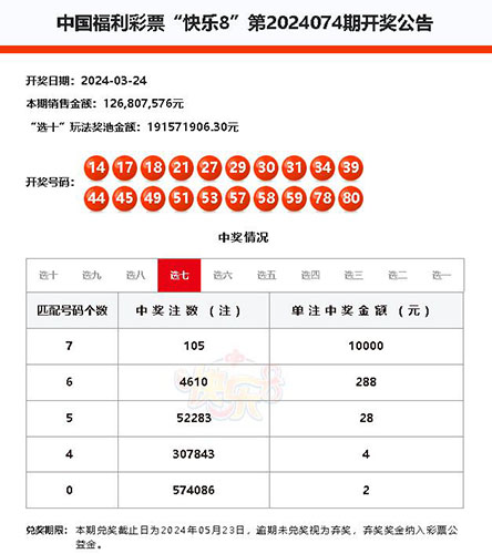 3月24日,我市福彩快樂8傳來中獎(jiǎng)喜訊,一位幸運(yùn)市民在快樂8第2024074期中得獎(jiǎng)金15萬元。