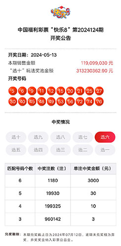 5月13日,一位幸運市民在快樂8第2024124期中得330注“選六中六”,攬獲獎金99萬元。