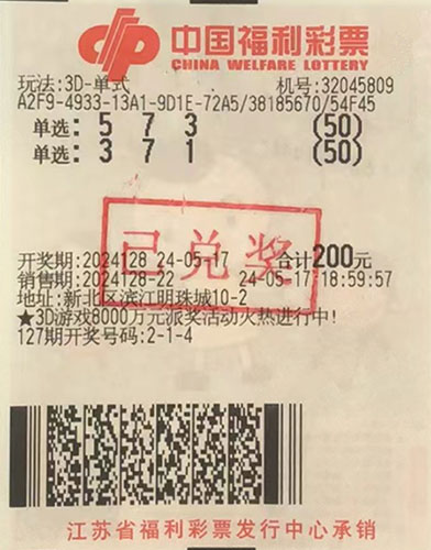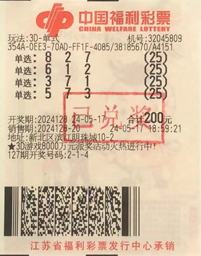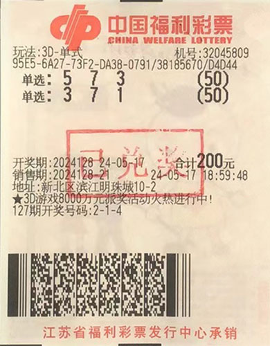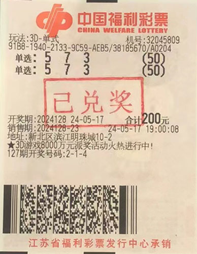 據了解,中獎市民小周(化名)平時愛玩電腦票,當期他在新北區(qū)濱江明珠城32045809福彩投注站,對號碼“573”進行了475倍投注,結果幸運擊中開獎號碼“573”。根據派獎規(guī)則,單注單選獎金由原先的1040元提高至1300元,因此,小周本次共計攬獲獎金61.7萬余元,其中包含派獎獎金12.3萬余元。
