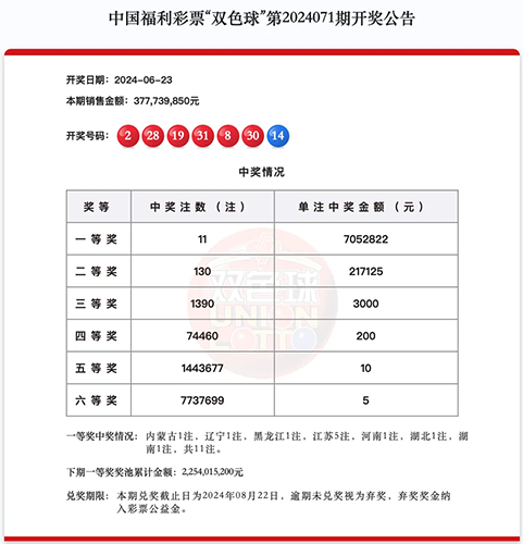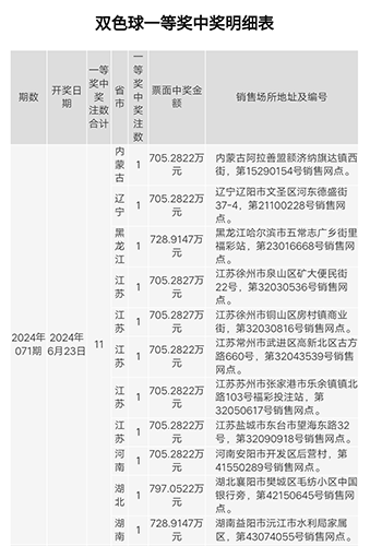 當(dāng)晚,雙色球第2024071期開獎(jiǎng),開出紅球號碼2819283031,藍(lán)球號碼14。該期雙色球全國一等獎(jiǎng)中出11注,單注獎(jiǎng)金705萬余元,其中1注雙色球幸運(yùn)大獎(jiǎng)花落常州市武進(jìn)區(qū)。