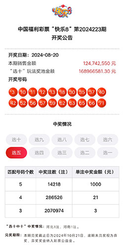 8月20日,我市一位幸運購彩者在快樂8第2024223期以“選五4膽全拖+倍投”的方式攬獲獎金69萬余元。