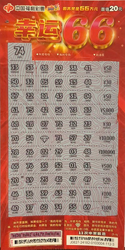 “幸運(yùn)66”面值20元,共有11次中獎(jiǎng)機(jī)會(huì),最高獎(jiǎng)金66萬(wàn)元。刮開(kāi)覆蓋膜,如果任意一個(gè)“我的號(hào)碼”與“中獎(jiǎng)號(hào)碼”相同,即可獲得該“我的號(hào)碼”所在行對(duì)應(yīng)的獎(jiǎng)金;如果在“我的號(hào)碼”區(qū)刮出“鉆石”圖符,即可獲得該圖符所在行對(duì)應(yīng)獎(jiǎng)金的10倍。中獎(jiǎng)獎(jiǎng)金兼中兼得。