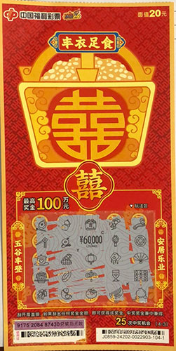 “囍”票面值20元,共有25次中獎(jiǎng)機(jī)會(huì),最高獎(jiǎng)金100萬(wàn)元。玩法非常簡(jiǎn)單,刮開(kāi)覆蓋膜,如果刮出任何獎(jiǎng)金金額,即可獲得該獎(jiǎng)金。中獎(jiǎng)獎(jiǎng)金兼中兼得。
