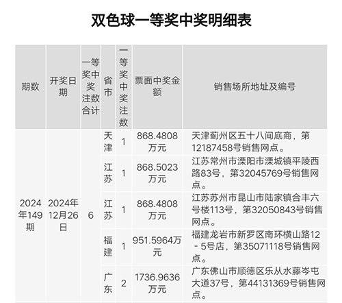 12月26日晚,福彩雙色球第2024149期開獎(jiǎng),開出紅球號(hào)碼3、9、16、17、18、22,藍(lán)球號(hào)碼16。當(dāng)期雙色球一等獎(jiǎng)中出6注,單注獎(jiǎng)金868萬余元,其中1注一等獎(jiǎng)花落常州溧陽(yáng)市。