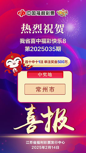 2月14日,福彩快樂8游戲第2025035期開獎,全國“選十中十”僅1注,現(xiàn)身常州,由我市一位幸運(yùn)兒攬獲獎金500萬元。