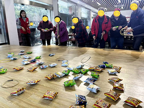 暖場結(jié)束后,暖心拼圖、筷樂夾物、蛙舌擊物、趣味套圈等游戲輪番登場。在挑戰(zhàn)拼圖速度的環(huán)節(jié)中,大家齊齊為參與者加油助威;筷樂夾物環(huán)節(jié)配備了兩根巨型筷子,每當有參與者成功夾起玩偶,觀眾席上便掌聲雷動;蛙舌擊物游戲里,參與者戴上青蛙嘴巴道具,用力吹出“舌頭”擊倒目標小物件,那逗趣的模樣引得眾人捧腹大笑;套圈區(qū)域則準備了各式各樣的小零食作為獎品,大家玩得不亦樂乎。
