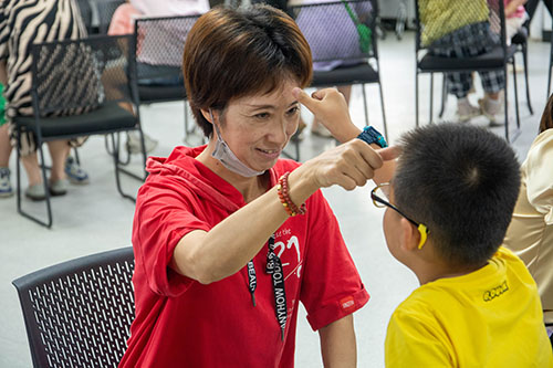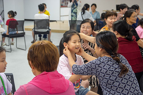 在接下來(lái)的“內(nèi)外圈技術(shù)”環(huán)節(jié),家長(zhǎng)和孩子們一對(duì)一相向而坐,通過(guò)眼神對(duì)視、點(diǎn)贊額頭、輕柔耳垂等方式互打招呼,訴說(shuō)對(duì)方身上的積極品質(zhì)。“我面對(duì)困難時(shí)心態(tài)比較好”“我在做家務(wù)時(shí)特別勤快”“我會(huì)幫媽媽分擔(dān)家務(wù)”……在家長(zhǎng)的鼓勵(lì)下,孩子們清脆悅耳的聲音在現(xiàn)場(chǎng)此起彼伏地響起。