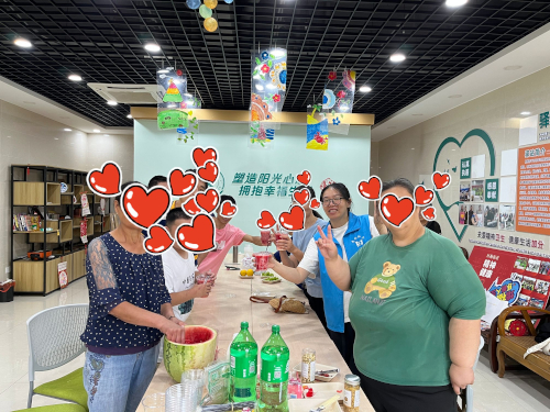 活動(dòng)伊始,康復(fù)員們分享了自己鐘愛(ài)的水果,并開(kāi)展“水果蹲”小游戲,不僅鍛煉了認(rèn)知能力,更在游戲中增進(jìn)了彼此間的了解和友誼。在隨后的飲品制作環(huán)節(jié),康復(fù)員在社工的指導(dǎo)下分組動(dòng)手,分別制作了清爽解暑的西瓜養(yǎng)樂(lè)多、酸奶果切、檸檬紅茶等飲品。幾位康復(fù)員代表還帶著自己親手制作的飲品前往社區(qū),向給予他們幫助和支持的阿姨們表達(dá)感謝。