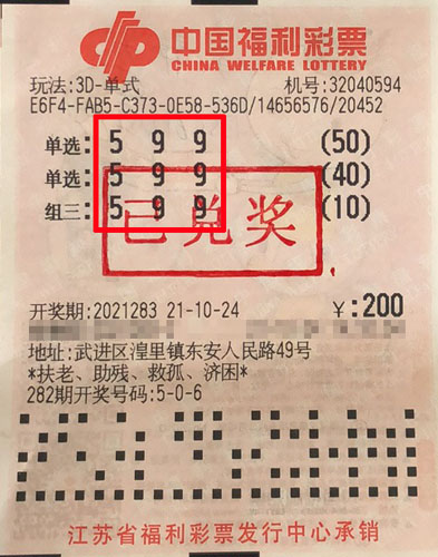 據(jù)了解,中獎市民俞先生(化名)是福彩的老朋友了,對3D游戲更是情有獨鐘,在號碼選購方面也頗有研究。當期俞先生分別在武進區(qū)的32043510和32040594福彩投注站,共計對號碼“599”進行了190倍單選投注和20倍組選三投注,結(jié)果幸運擊中開獎號碼。根據(jù)全省3D游戲3600萬元派獎活動規(guī)則,單選獎金每注增加至1400元,組選三獎金每注增加至460元,因而俞先生本次共計攬獲獎金27.5萬余元,其中包含派獎獎金7萬余元。