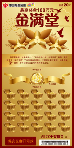刮刮樂“金滿堂 ”票面以金色為主色調(diào),配以同色系的寶箱、幸運鳥、富有質(zhì)感的金葉等元素,正與票名相呼應(yīng)。該票面值 20元,有20次中獎機會,最高獎金 100萬元。刮開覆蓋膜,如果任意一個“我的號碼”與“中獎號碼”相同,即可獲得該“我的號碼”下方所對應(yīng)的獎金,中獎獎金兼中兼得。如果刮出“福袋”圖符,即可獲得玩法區(qū)內(nèi)所有的獎金之和。有興趣的彩民,都可以光臨附近彩站試試手氣、碰碰運氣,說不定下一個大獎就由您帶回家!