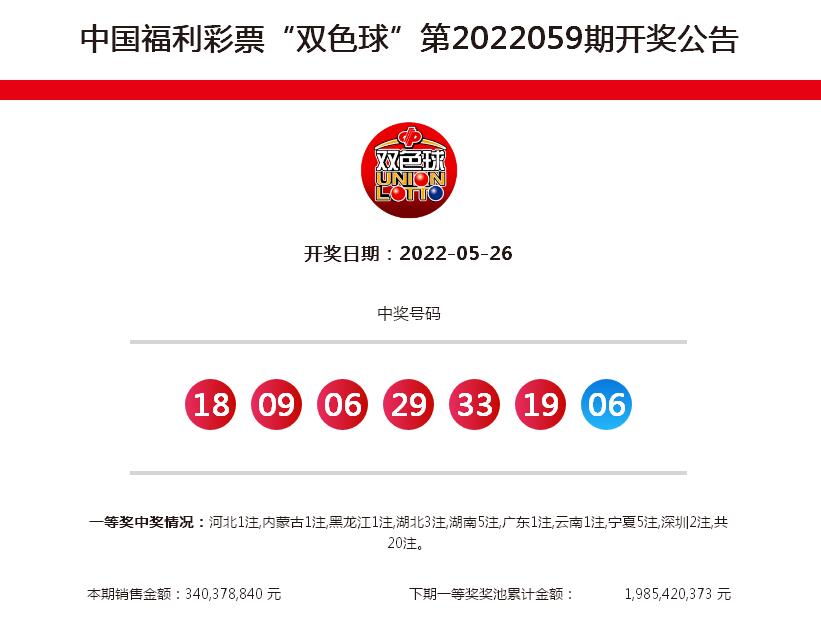5月26日晚,雙色球第2022059期開出紅球06、09、18、19、29、33,藍(lán)球06。當(dāng)期全國開出二等獎216注,單注獎金8.26余萬元。我市一位幸運(yùn)市民豪攬50注二等獎,喜中獎金413萬余元。