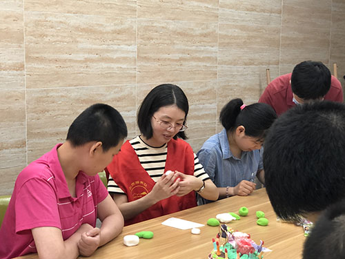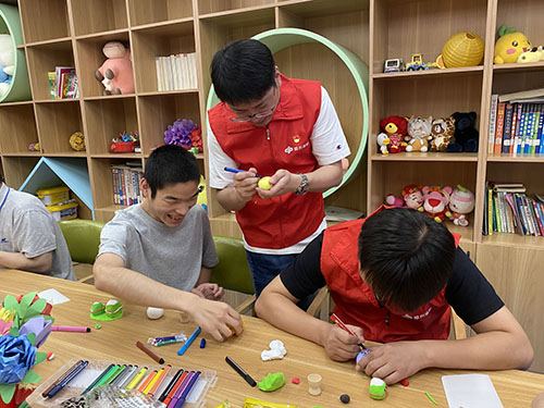隨著老師的講解,志愿者和孩子們一起成為學(xué)生,開啟捏制彩泥粽子的環(huán)節(jié)。有的孩子心靈手巧,上手極快;有的孩子創(chuàng)意十足,在老師的講解外增添了額外童真;有的孩子開朗活潑,不時向志愿者求助——“這個我不會捏,你幫我這個你做得好,再做一個”……繪制蛋殼時,一個手勢、一句夸贊,讓孩子們都露出了愉悅的笑容。這些創(chuàng)意手工互動中,志愿者們也充分感受到了中國傳統(tǒng)習(xí)俗的魅力,進(jìn)一步豐富了精神文化生活。