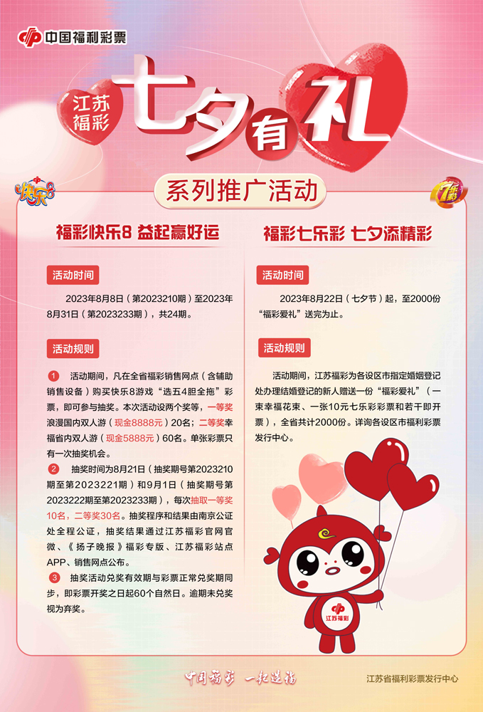 為感謝廣大購(gòu)彩者對(duì)福彩公益事業(yè)的支持和熱愛(ài),江蘇福彩于2023年8月8日至8月31日特別推出“七夕有禮”系列推廣活動(dòng)。